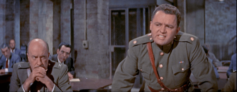 Barking and saluting: Charles Bickford, Ralph Bellamy, Fred Clark, Jack Lord, James Daly, Peter Graves, Darren McGavin, Robert F. Simon, Charles Dingle, Will Wright, Dayton Lummis (as Douglas MacArthur, looking the part), Ian Wolfe (as Calvin Coolidge–“hey, want to play the least exciting President in our history?”), Gregory Walcott, Carleton Young. 100 minutes.