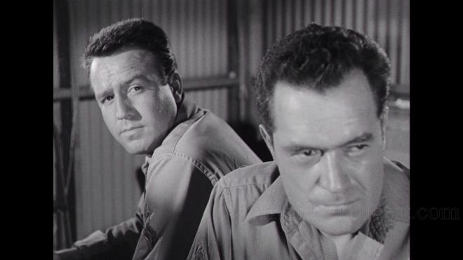Gutsy stuff at the time, yet other than its obviously commendable “we’re all alike” message and most of the acting, the hard-breathing dramatics are a harder sell today. Much is due to the script’s utter lack of anything resembling military authenticity: these guys make enough noise on patrol to be heard in Tokyo, backtalk the officer, and light up smokes day & night, a great way to get snuffed by a blind geisha girl alone let alone battle-hard Japanese soldiers. The psychobabble with the shrink is also ridiculous, and otherwise laudable Edwards (his debut) is prodded into some over-emoting that reaches past gripping to the plain hysterical. Arthur Laurent’s wrote the original play (in which the maligned character was Jewish), and Carl Foreman did the screenplay: each had beating liberal hearts on sincere sleeves, but this sledgehammer approach is neither’s finest hour. The idea was sound, the execution shaky, directed by Mark Robson, produced by Stanley Kramer: Foreman, Robson and Kramer had just scored with Champion. All would have their respective shares of career highs & lows over the next two+ decades. Another misfire is a puzzler as it comes from renowned composer Dimitri Tiomkin: this overly busy score has to be his least impressive, though it’s amusing to detect cues he’d use a few years later on The Thing. Much of it gets downright silly.