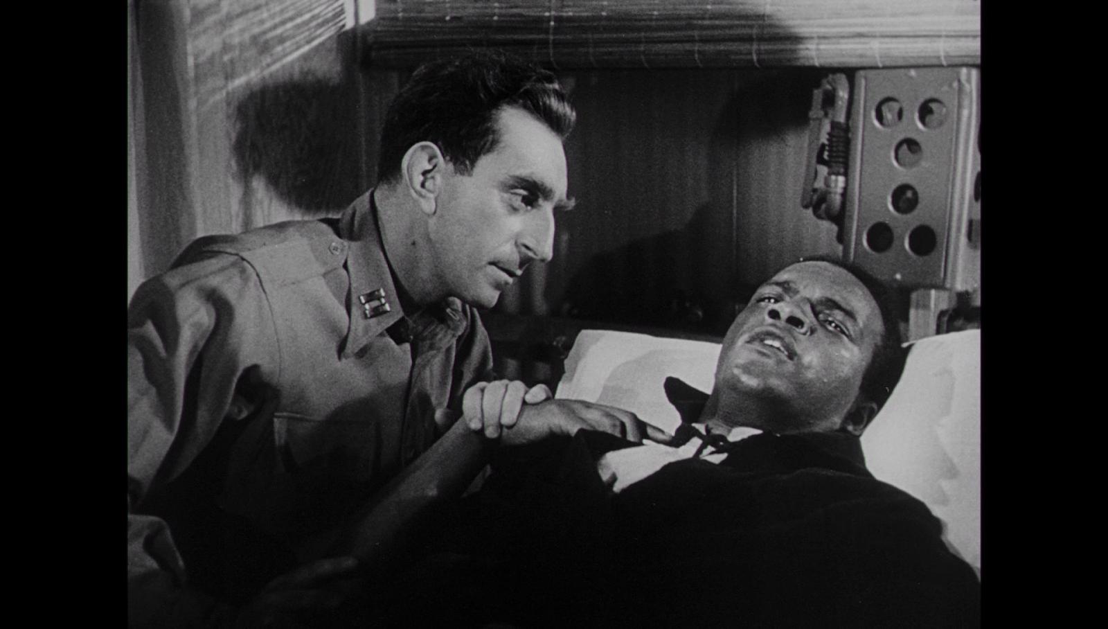 At first, Moss is happily surprised to find ‘Finch’ (Lloyd Bridges), a close buddy from high school, is part of the team, led by a young officer (Douglas Dick) who seems fair enough. Taciturn vet ‘Sgt. Mingo’ (Frank Lovejoy) is okay with Moss but surly ‘Corporal T.J. Everett’ (Steve Brodie) is a blowhard bigot and makes that clear from the outset. One is killed (tortured first), another maimed and the traumatized Moss suffers a psychological breakdown resulting in paralysis: he can’t walk. An Army psychiatrist (Jeff Corey) tries to spur his recovery.