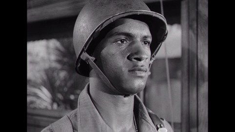 HOME OF THE BRAVE made an impact in 1949 as the first of a quartet of releases that year that tackled the racism imbedded in the nation’s fabric and still encoded in law at the time. Of the four, Pinky—a high-profile drama about a light-skinned black girl passing as white—was the biggest success (a hit, 6th place), followed by the now-forgotten Lost Boundaries (a black man passing as white, again surprisingly well at 43rd place), with the well-reviewed lynch mob story Intruder In The Dust a distant 203rd. Home Of The Brave ranked 99th, but scored a win with a $3,600,000 gross since it had been shot quickly and cheaply for just $370,000. Set in the Pacific in WW2, the tense tale of racial animus in the service took thematic advantage of the Civil Rights shift from the previous year, when President Truman ordered the armed forces to begin integrating. While ’49’s hit war films (Sands Of Iwo Jima, Battleground, Twelve O’Clock High, Command Decision and Task Force) focused on battles and the stress toll of ordering others to die, this intense small-scale plot focused on a five-man scouting patrol that takes place on a Japanese-held island. The mission has a profound effect on the men, especially on the outsider, ‘Private Peter Moss’ (James Edwards), a black soldier from an engineer battalion hastily ordered in as a replacement.