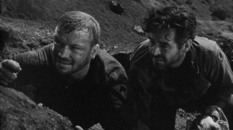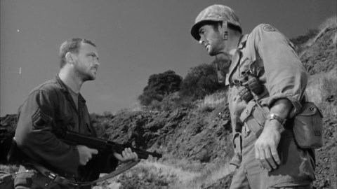 Rugged work from Ryan, Ray and Keith is augmented by a good crew filling out the ranks: Phillip Pine, Nehemiah Persoff, Vic Morrow, James Edwards and L.Q. Jones. The acting is interesting enough to make up for the not very convincing action scenes, rough but illogical. To its credit the script doesn’t indulge in sappy sermonizing, dopey flashbacks to gals back home or twiddling Big Picture exposition, keeping the focus on the exhaustion and disorientation faced by men on the line. It does risk existentialist theatricality at times, a bit too on the nose with some of the confrontations, and the resolution has the whiff of pretense. Still, hard to lose with believable footsloggers like raw-boned Ryan and burly Ray, who both incidentally did their bits in one war that actually made some kind of sense—it wasn’t the one in Korea.