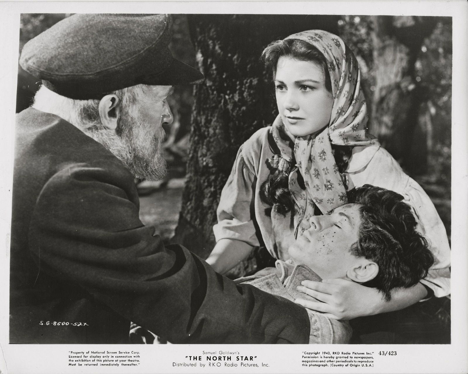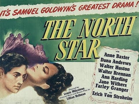 THE NORTH STAR, as in the U.S.S.R. (Communist Russia, for the history impaired) during World War Two, as fancifully imagined by producer Samuel Goldwyn’s handsome 1943 propaganda piece. Directed by Lewis Milestone, it was written by a Soviet-swooning Lillian Hellman as one of the boost-your-ally pictures that festooned the global fight to the finish. Showing sympathy for Luftwaffe-battered England, Nippon-ravaged China or the Philippines, and Nazi-subjugated European countries like France, Norway or Poland was an easier sell than trying to make Stalin’s dictatorship look not just heroic (its citizens were, beyond any question) but fibbing that if wasn’t for the Germans, “the Worker’s Paradise” was also a really swell place for the average Ivan or Natasha. In this lively resistance rally and in the same year’s diplomacy farrago Mission To Moscow, rosy Redness went a shipload of vodka too far, belly laugh concepts of the so-naive-it’s-cruel variety. *