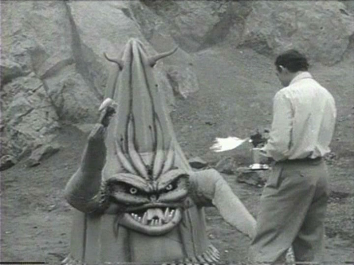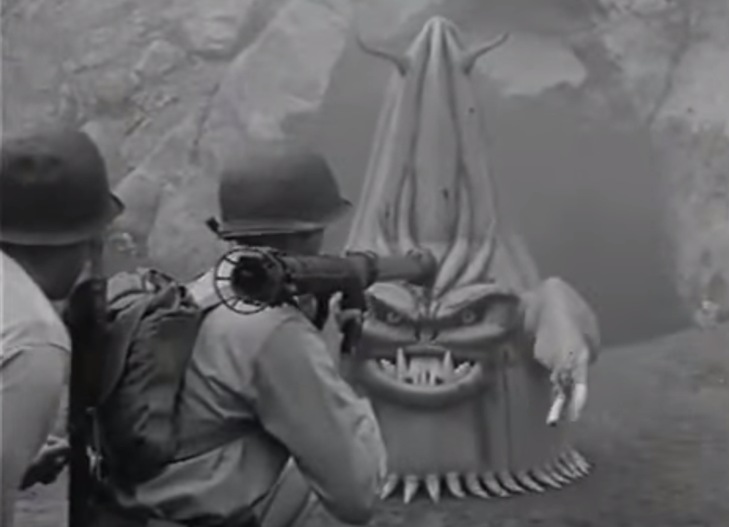 See, the science part comes with the whole emotions situation, as Tom’s conquer-bent pal from Venus intends to do away with humdrum human feelings as part of “its” master plan. If that brain-scrub entails doing away with most humans attached to their silly impulses, well, data is impartial. The budget could only afford one creature, but it’s a doozy, one of the great dorkus monsters of the era: part fruit, part vegetable, equipped with pincers, glowing eyes and severe dental hardware. If you encounter one of these, remember to bring a blowtorch, since bullets and even bazookas don’t have enough stopping power. At least this was one spaced-spawned sleaze that didn’t require zapping by electricity.