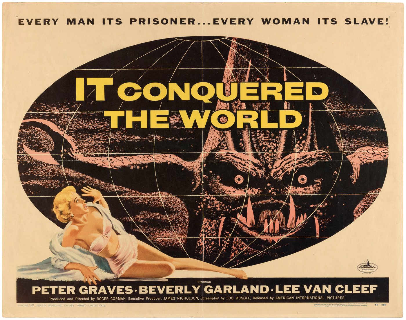 IT CONQUERED THE WORLD, a 1956 gift to goofiness from ambitious, throw-it-at-the-wall producer/director Roger Corman, states its case for limberger-upon-radiator greatness when ‘Dr. Paul Nelson’ (Peter Graves), discovering what his scientist buddy ‘Dr. Tom Anderson’ (Lee Van Cleef) is up to with that short wave gizmo in his living room. PAUL (aghast but holding it together: “You mean a superior intelligence has come from Venus in my satellite, established residency, turned off the world’s power, and is about to take over the world.” TOM (patient, casual): “This superior intelligence is a personal friend of mine.”