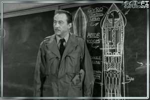 Four men and a woman blast off from Earth to explore the Moon. Space suits and helmets are absent, but leather bomber jackets, gasmasks and sidearms are on hand (who will they shoot on the moon?) The gal, ‘Dr. Lisa Van Horn’ (“Ph.D.,chemistry”), played by languorous-locked Ona Massen, is pitched woo from Lloyd Bridges’ pilot, ‘Col.Floyd Graham’. He muses “I’ve been wondering, how did a girl like you get mixed up in a thing like this in the first place?” When she replies “I suppose you think that women should only cook and sew and bear children?”, he settles the issue with “Isn’t that enough?”
