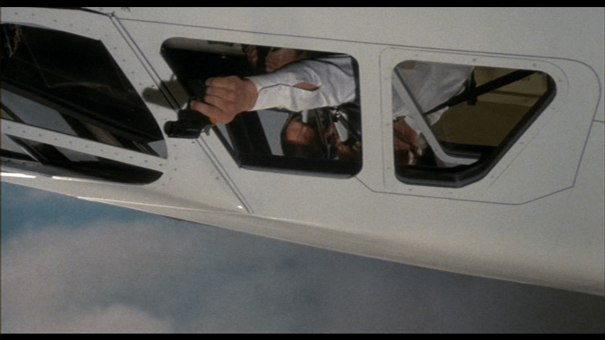 This is when George Kennedy, flying a jet at hundreds of miles per hour, shoots a flare out the window to distract a heat-seeking missile.