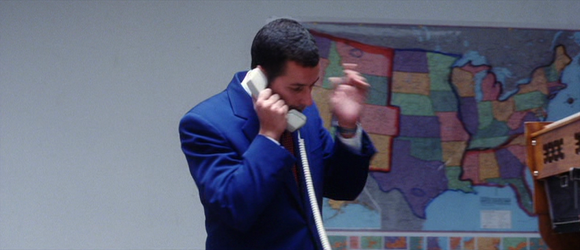PUNCH-DRUNK LOVE slurred, stumbled and spewed at the box office in 2002, audiences evaporating after gulled friends reported on yet another example of critics being either punchy or drunk to love this surrealist rom-com dramedy featuring Adam Sandler doing a mawkish Jerry Lewis-take-me-serious-because-under-my-infantilism-I’m-in-pain exercise in smugness written & directed by Paul Thomas Anderson. If you think that run-on sentence was overkill, it’s haiku next to the dawdling collection of endless, pointless scenes with not-believable-for-a-minute cipher-people that make the 95-minute running time feel like watching a chess game from the top row of a stadium. In the fog.
