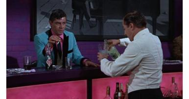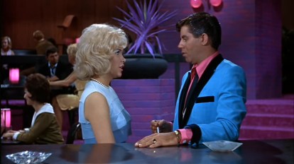 Though a variation of the Kelp character had been deployed by Lewis five years earlier (1958’s Rock-A-Bye Baby) and would turn up in The Family Jewels (1965) and The Big Mouth (1967), the genesis for the plot came from Robert Louis Stevenson’s “Strange Case Of Dr. Jekyll And Mr. Hyde”. The canard bandied for a while had Buddy as Jerry’s backhand at ex-partner Dean Martin, but Lewis vehemently denied that (and cool cat Dino wasn’t a dick like Buddy): it’s easier to discern the smug alter ego as part & parcel of the gifted but taxing comic himself. At any rate, until he pushes a maudlin finish on the cheerfully gaudy show, Lewis’ undeniable skill and timing get a good number of laughs out of both incarnations. *
