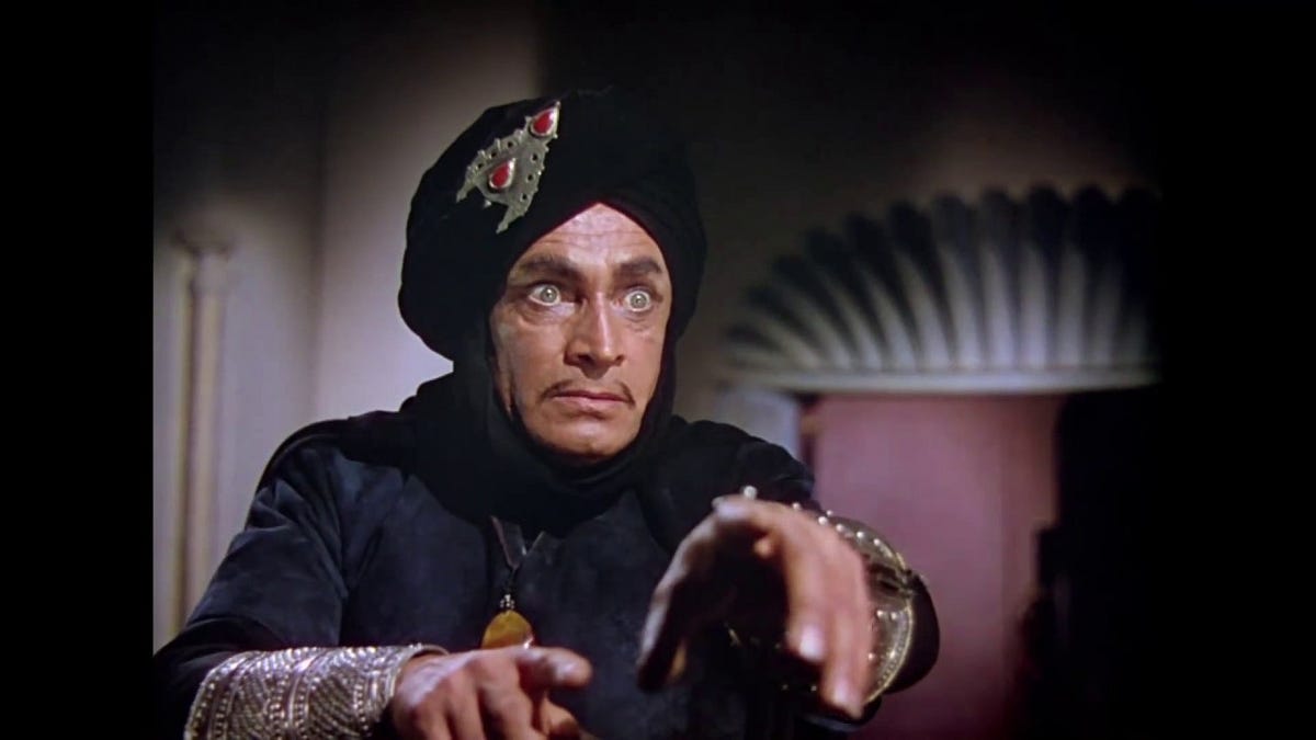 Ancient Mesopotamia’s fabled cities of Bagdad and Basra are springboards for perilous deeds of bravery, breathless declarations of eternal love, venomous court intrigue and invoked magic.  Bagdad’s usurped king ‘Ahmad’ (John Justin) and genial, resourceful thief ‘Abu’ (Sabu) bond friendship when their fates entwine as Ahmad seeks to reclaim his throne from the vile vizier ‘Jaffar’ (Conrad Veidt), who has also absconded with ‘the Princess’ (June Duprez) of Basra. She’s fallen head over veil for the equally besotted Ahmad. Sounds like time is ripe for  mechanical toys come to life, a huge genie with an oversized attitude, a giant spider and a flying carpet. Add a few songs, some laughs: bingo! you’re five again.