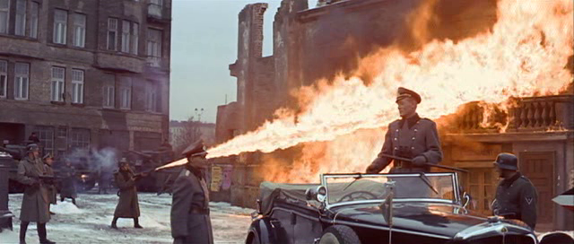 Spiegel repeatedly undercut director Litvak. Despite a good deal of money thrown into sets, uniforms, crowd scenes and the big action setpiece in a section of Warsaw, using Russian-built tanks (Poland then still part of the Soviet Bloc) the movie too often has a static look. Script contributor Vidal went so far as to suggest O’Toole’s over-the-top performance amounted to sabotage to get back at Spiegel. How much you buy the self-serving sniping of viper Vidal is up to you. Maybe O’Toole rebuffed a pass? Bien brûler mon short: how dare we! Badly hurting scene after scene is a wretched score from, of all people, Maurice Jarre. That’s a dismal thing to hear say, since monsieur Jarre created some truly wonderful soundtracks (he’d just done two great jobs on The Professionals and Is Paris Burning?) but, like us all, he was also capable of the occasional dud (Ryan’s Daughter), so maybe the bleak and distasteful nature of the material simply didn’t inspire his muse.
