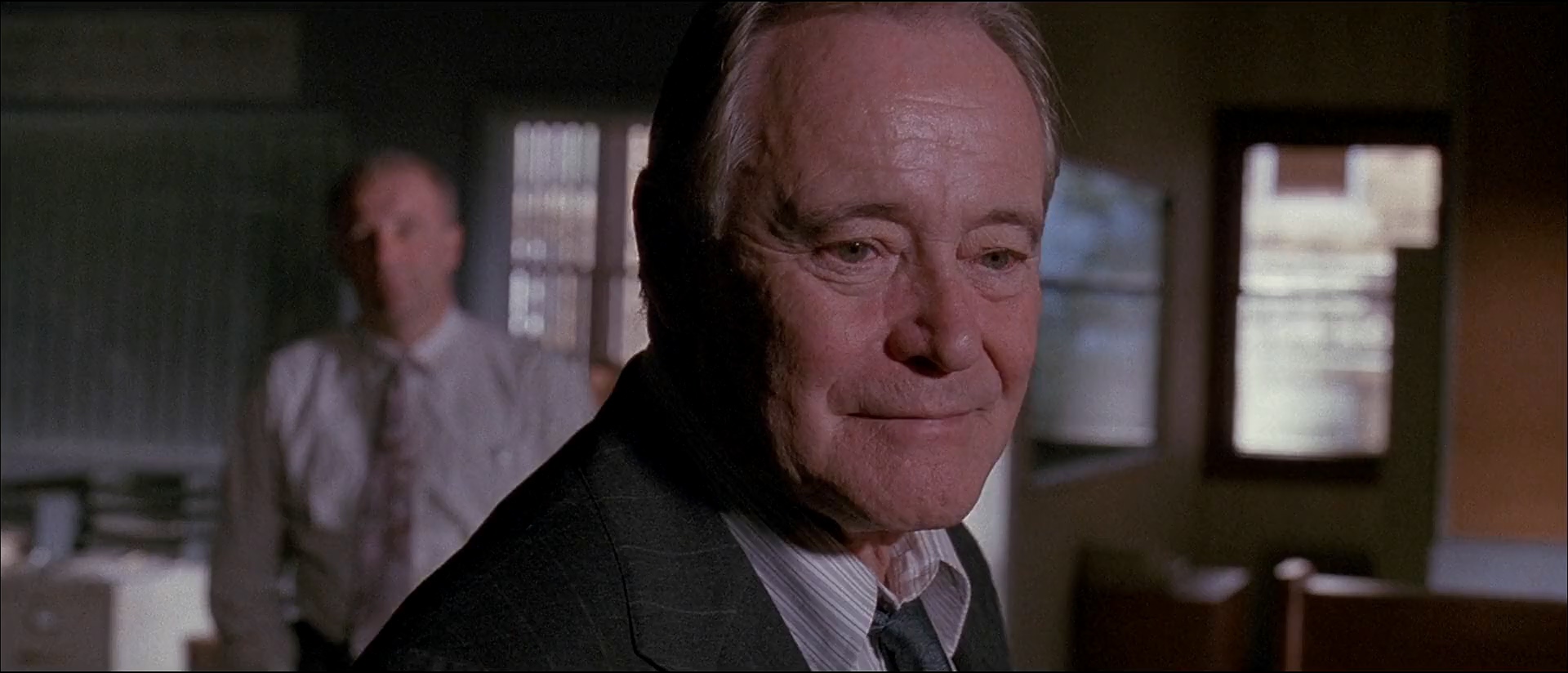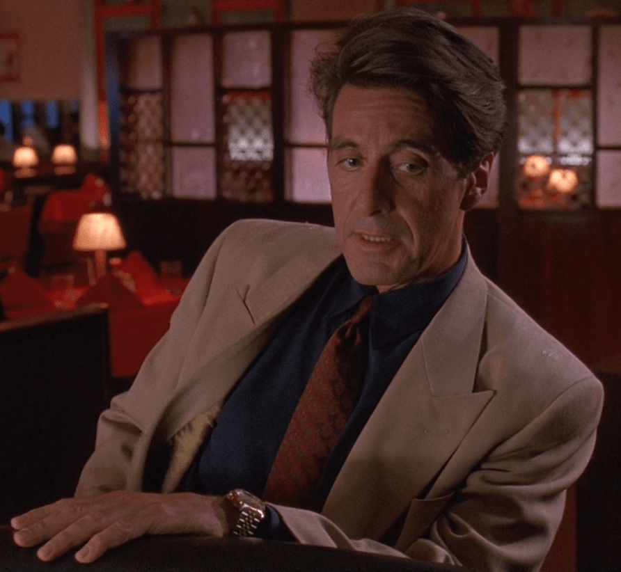 The overkill of the writing style (give the f-word a f-ing breather for f’s sake) does, however, provide its stellar brace of actors with explosive hollow-point ammo and on that level the movie is a take-no-prisoners red meat feast for the cast. For my chump change, the most memorable pieces of performance craft in this one are not in how the lines are delivered but in the subtle looks and gestures that tell more about the characters than their verbal displays of rage, contempt and panic (goodness does not abide in Manetland). Baldwin’s brief, brutal tirade is the signature speech and he’s magnetic at being malevolent, but we’ll go with Pacino and Harris carving the choicest cuts. Pacino was Oscar-nominated for Best Supporting Actor (was Baldwin pissed? whaddaya think?) in the same year he won Best Actor for Scent Of A Woman. That’s a showier role, but he’s better here.