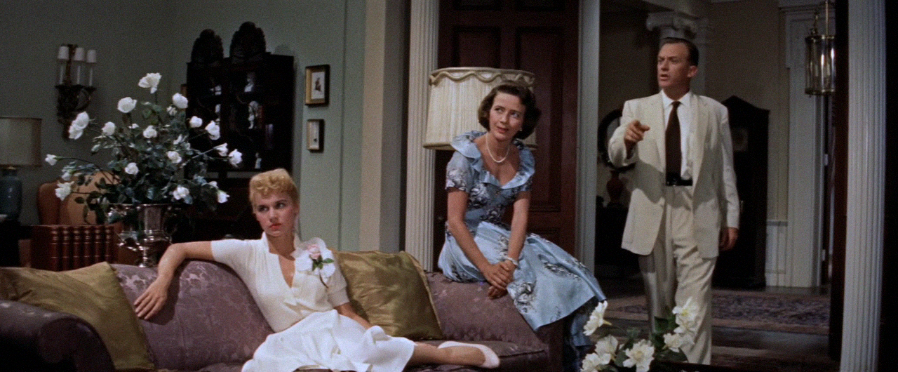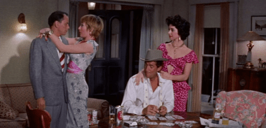 While auteur-awed critics (see “fawning over-analysis”) extol Minnelli’s skill at mood enhancement for the film’s success (accomplished as the fastidious, painstaking director had to deal with the hipster stars blasé attitudes and hijinks), it was power-player Sinatra who insisted on casting MacLaine and Martin. Frank & Dean had known each other previously, but their friendship cemented during this time, not just spurring the coming escapades of The Rat Pack but Dean’s emergent solo career as an actor in something other than comedies. Martin’s innate laid-back affability makes the who-gives-a-damn? Bama character engaging even when he’s being a louse. MacLaine (with a great costume & prop touch) turns ‘tramp’ Ginny into by far the warmest character in the piece, and she doesn’t indulge in the shrillness that would grate some of her later roles: her poignant classroom plea to the emotionally opposite Hyer (character and actress) won the movie’s warmest reviews and cinched award consideration.