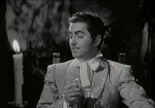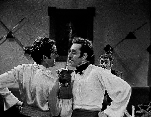 Stylishly directed by Rouben Mamoulian, the puckish script by John Taintor Foote playfully teases Diego’s popinjay prissiness put-on (Power relishing the chance to kid, self-confident enough to risk it) and manages to get away with loaded lines like Diego’s dig at Pasquale, who’s jabbing at an orange: “Captain, you seem to regard that fruit as an enemy.”