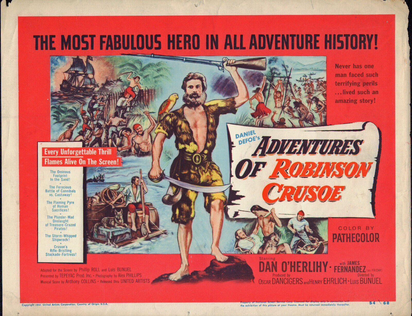 ROBINSON CRUSOE is the onscreen title, yet the 1954 movie is nearly always referenced as Adventures Of Robinson Crusoe. Irish character actor Dan O’Herlihy, 33, drew his only leading role as the hero, and his fine work put him on the Academy Awards ballot roster for Best Actor. Heady stuff against Crusoe-like odds: Marlon Brando (On The Waterfront), Humphrey Bogart (The Caine Mutiny), Bing Crosby (The Country Girl) and James Mason (A Star Is Born). Like O’Herlihy’s fabled castaway, every one of those troubled characters were isolated, either by circumstance or behavior. His long shot didn’t win (Brando was chosen) but his performance holds up, and the film has a number of impressive scenes, as directed by the iconoclastic Luis Buñuel.