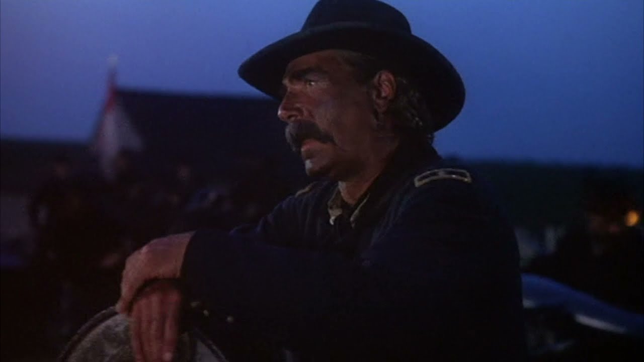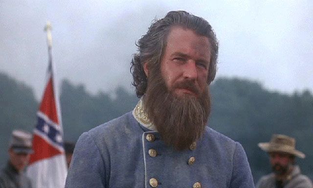 The running time is 254 minutes, 271 in the director’s cut. Sit back & factor in two medium popcorns, a pack of Red Vines, a bag of peanut M&Ms and a root beer float: the length presented could easily been shorn of some excess, but even at more than four hours it left out most of the actions that comprised the struggle. Six hours might’ve done it, with much of the same cast but under an equally passionate but more judicious director. That was Ronald F. Maxwell, whose previous credits were several undistinguished comedies; he also wrote the screenplay. Though epic-scale battle movies play best on a big screen, this one, despite having 5,000 Civil War re-enactors volunteering as extras, shows more of its pesky shortcomings in a larger projection. Most of it is very good, even if persistently dogged by flaws (skirmishers ahead of the main body, if you will); making an objective report is—like the battle—somewhat of a see-saw.