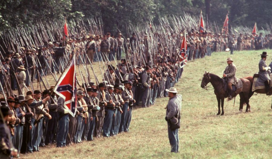 Like the book the script focuses almost exclusively on a number of the officers involved (a token fictitious sergeant speaks for the cannon fodder troops–on the Union side) and centers around three separate parts of the battle including the two most celebrated: the Yanks heroic defense of a hill called Little Round Top and the Rebs valiant, go-for-broke frontal assault forever known as ‘Pickett’s Charge’.