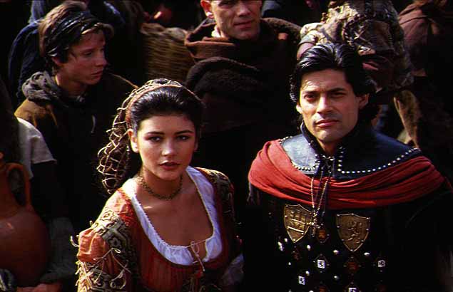 …as it is in the ship-shapeless screenplay concocted by Mario Puzo, John Briley and Cary Bates, directed in slapdash manner by John Glen. He’d helmed four of the weakest 007 flicks (Octopussy, A View To A Kill, The Living Daylights, Licence To Kill) and one (For Your Eyes Only) that was okay. FYEO is a masterpiece next to this limburger milkshake, which, apart from some decent at-sea shots, is 120 minutes of poorly cast malarkey, a slop job of sentiment (who knew Chris was so considerate of the natives?: no one who lived then) and swashbuckling (another thing he wasn’t, unless you consider slavery and genocidal slaughter rollicking). Even with all the expense, it looks like it was made for TV, and the locations (Spain, Portugal, Malta, the U.S. Virgin Islands) are not well used. When then-current 007 Timothy Dalton bailed, a last-minute shove-him-in replacement for the lead was French actor Georges Corraface, who’s about as persuasive and commanding as a guy in a shampoo commercial. He’s 3rd-billed behind Marlon Brando (wasting our time and stealing five million bucks as Inquisition heretic hunter Torquemada) and Tom Selleck (as King Ferdinand: we repeat, Tom Selleck as Ferdinand); both are glorified cameos. There are bemusing early appearances from Benicio Del Toro, 24, and Catherine Zeta-Jones, 22 in her feature debut as Chris’s mistress: they look like teenagers and pretty much act like it: talent evolved.