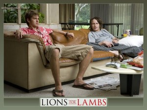LIONS FOR LAMBS made a gallant, thoughtful and sincere 2007 counterattack on the run-of-the-complex rah-rah agitprop fodder that’s bombed us with payloads of steer manure since St. Reagan & Co. hijacked the national narrative four decades back. Noble intent fell, missed in action by public apathy about wars playing out on TV (“like, another movie where, like, you need, like, a map, or whatever”) and sniped by the clannish circular firing squad of critic-think that’s mosquito’d around since the mid-60s. The former lies in a systematically dumbed-down populace, spoon-fed lies, addicted to a diet of pap. The latter’s barfed from ostensibly politically aware reviewers who wheeze about a lack of mainstream films that challenge mainline dogma, yet when one shows up they group-whizz on it like it’s a poison pill from the Pentagon.