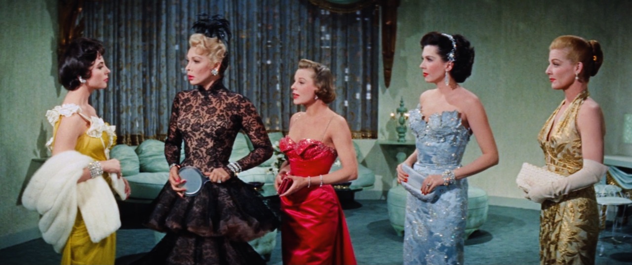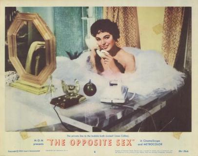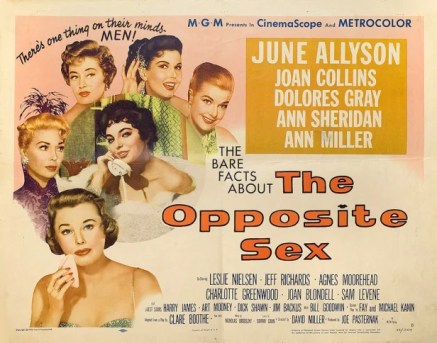 THE OPPOSITE SEX, in this case, the female of the species (pre-‘controversy’:do stow your alarm), as in The Women, the 1939 hit of which this 1956 groaner is a glossy remake. MGM plowed in $2,834,000. It’s star-laden, in Metrocolor and CinemaScope! Men are added this time! And Musical Numbers! The ad campaign screeched “FAST, FRANK and FUNNY!” Too bad it isn’t any of those.