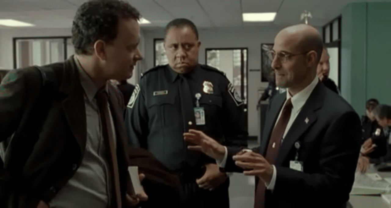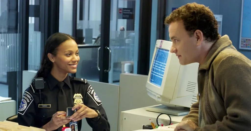 ‘Viktor Navorski’ (Hanks), arrives in the USA from his native ‘Krakozhia’ only to find that his East European homeland has suffered a coup, and the States, not recognizing the new regime, won’t let Viktor in. Or out. Relieved of passport, he’s stuck at a terminal in JFK airport. Shock and confusion make way for determination and ingenuity, as the good-natured refugee befriends a variety of airport and airline employees and makes himself useful in his new ‘home.’ One plus is bemused stewardess ‘Amelia Warren’ (Catherine Zeta-Jones); a definite minus is ‘Frank Dixon (Stanley Tucci), the airport’s stony Acting Field Commissioner.
