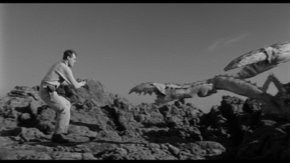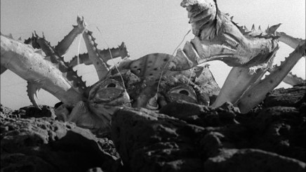 A team of scientists and sailors are trapped on a fast-collapsing Pacific island with a couple of gigantic crabs that don’t just maim mortals; they consume their thought processes and can project their voices, attributes that quickly lead tiered members of the supporting cast to their respective dooms. ‘Crab‘ wouldn’t carry the same mercury poisoning spell without the script by Corman word genie Charles B. Griffith, who also has a top-this moment as the sailor who gets his head pincer’d off. While the dialogue is asinine, the claim-our-consciousness idea is interesting, and Corman paces the execution fast enough (it’s only 63 minutes long) that if you’re forgiving and nostalgic (or were/are five years old and spookable) AOTCM succeeds against its obvious limitations—the dorkish back & forth people chatter, acting that (apart from one well-known ‘professor’) is less-than-inspired and the sublimely phony, hilariously clumsy mockups of the scuttlers: for a swell big-crab-feed, land on 1961’s Mysterious Island.