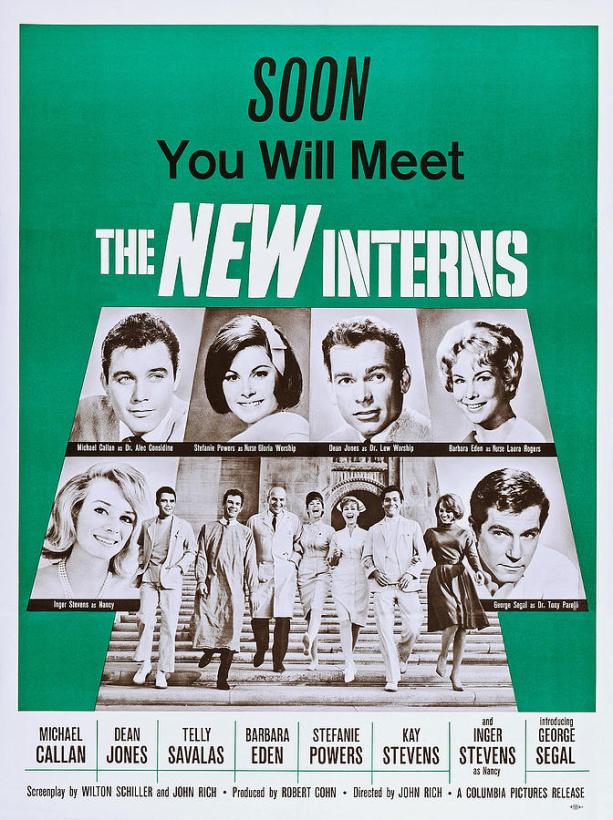 THE NEW INTERNS, flatulent 1964 sequel to the 1962 hit The Interns managed to prescribe a respectable 38th place at the year’s box-office, the $7,600,000 payment insured by a viable cast of new faces (with a few returnees) and that movie medics were backstopped by their popular colleagues on the boob tube. The drama is cheesy and the ‘wild’ partying makes you wince, but the actors are game. *