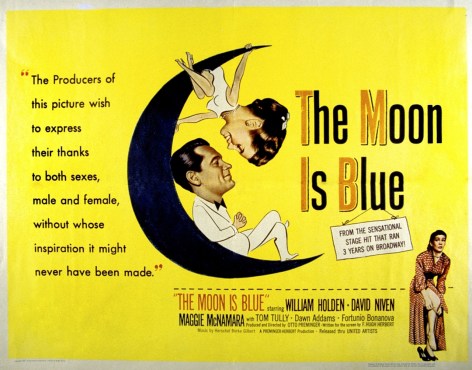 THE MOON IS BLUE—on-the-make rogue ‘David Slater’ (David Niven) hints “The three things I live for are steak, liquor, and sex.” This blithe dispense of creed, which tickled audiences in 1953, would no doubt have today’s cringers panic for the exits. Such obvious self-kidding could twist our new strain of moralizers to huffingly post a caution that it came from a movie that infamously tasked the Ike Era with public airings of “virgin”, “seduce” and “mistress”, firsts in a Hollywood glibcapade. Yet, up for a tumble, Society didn’t crumble, even if the blasphemy was banned in Boston. In fact, the flippant fluff was a boxoffice smash.