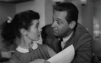 Virtuous actress (fingers tremble over the keys) ‘Patty O’Neill’ (Maggie McNamara, 24) meets charming, semi-rake architect Don Gresham’ (William Holden, 34) at the viewing platform of the Empire State Building and before you can say ‘brittle stagy dialogue’ they’re fencing innuendoes like pretend sophisticates. The ‘will they?’—more to the point, ‘will she?’—dares are dialed up when Don’s more rakish neighbor (Niven, 42, clipped Brit delivery, trimmed mustache) turns up with telescopic interest on rabbit-in-crosshairs Miss O’Neill. Men are such…men.