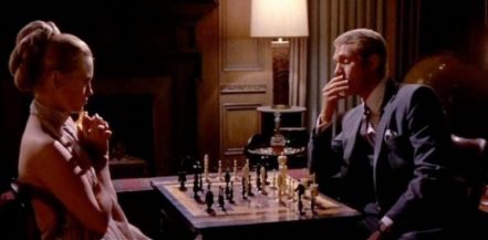 THE THOMAS CROWN AFFAIR laid it on the line for audiences of 1968 when its cool caper crook/millionaire/hero ‘tells it like it is’ to his Voguish/panthergirl/ babe-in-arms: “It’s not the money. It’s not the money. It’s me. It’s me and The System. The System.” Right on! The young and the hip ‘dug it’ at the time and made Mr. Crown’s sleek ripoff spree the year’s 17th most popular night out. That bank heister Crown was rules-thumber Steve McQueen and his slick chick was to-kill-for Faye Dunaway fit perfectly with a slug of the fractious year’s national zeitgeist (well, for part of the population), reflected in trendy cinema output, which included Steve, 37, racing thru the year’s #2 hit, Bullitt (a cool cop? who wasn’t a private eye?) and 26-year-old Faye’s newfound fame bullet-sped by Bonnie And Clyde. With this eye-catching, brain-optional cotton candy treat the artifact factor doesn’t sell too well: it helps when watching to pretend it’s 1968 and you’re on the sprint side of thirty-five. *