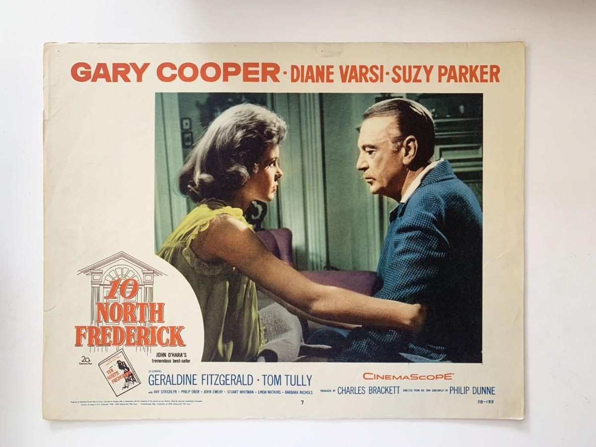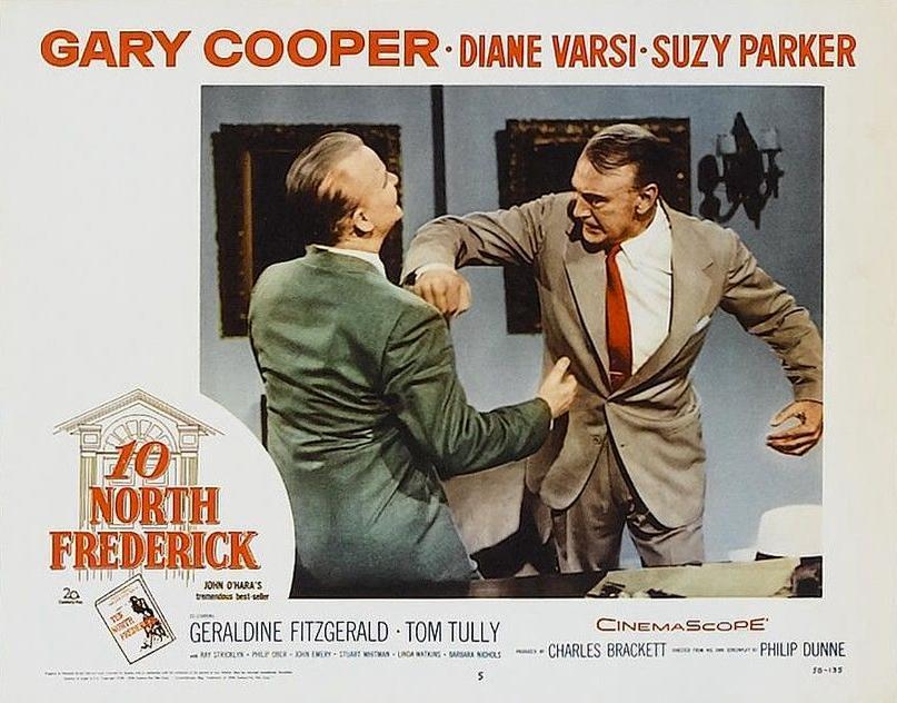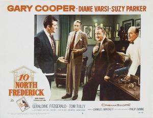 TEN NORTH FREDERICK was one of 1958’s two dozen pictures adapted from famous novels or hit plays. Here 102 minutes of family fragmenting/social strata drama was wrested from John O’Hara’s prize-winning 1955 bestseller. This was written & directed by Philip Dunne, who boasted a solid track record especially with adapting weighty novels (How Green Was My Valley, The Robe, The Agony And The Ecstasy). The results are uneven; top notch work from Gary Cooper and Geraldine Fitzgerald makes it worthwhile.