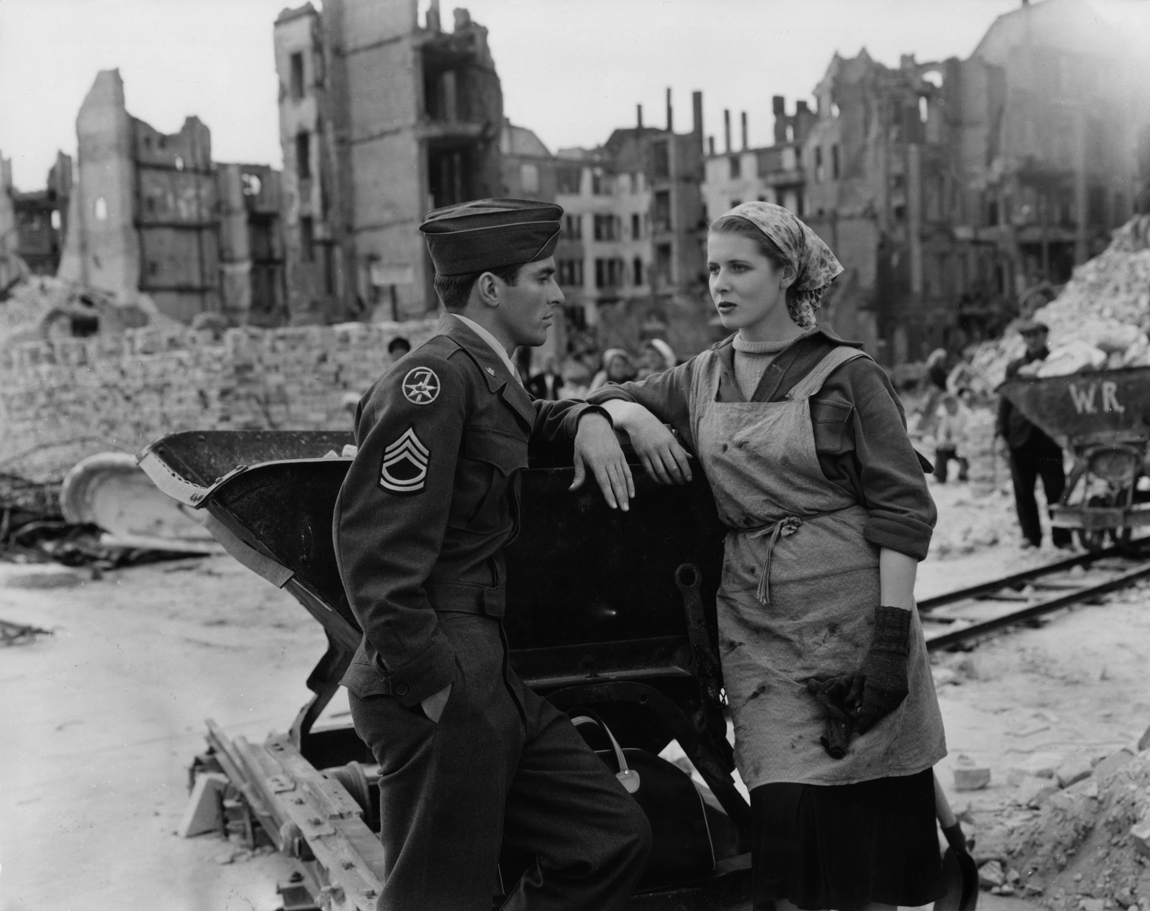 When the Soviets blockade the rail, road and water access into the divided city (the US, the USSR, Britain and France jointly administering sections), already prostrate Berlin faces starvation. The US and UK begin round-the-clock airlifts of coal and food. ‘Tech Sgt. Danny MacCullough’ (Montgomery Clift), flight engineer of a C-54 transport plane and ‘Master Sgt. Hank Kowalski’ (Paul Douglas), a ground-controlled approach operator, are buddies, though their temperaments are unalike. Thoughtful Danny falls for wistful, forlorn war widow ‘Frederica Burkhardt’ (Cornell Borchers), and she reciprocates, while German-hating Hank, a former P.O.W., bullishly lords it over ‘Gerda’ ((Bruni Löbel), his demure, cowed “Schatzi”. They all share a mutual friendship with genial ‘Herr Steiber’ (O.E. Hassie) a spy for the Russkies who’s actually working for the Yanks. But all is not what it—or they—seem to be.