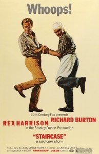 STAIRCASE, another bad movie I watched so that you don’t have to. Stanley Donen, who directed a dozen great pictures, also called “Action!” & “Cut!” on a number of duds, this 1969 wanker one of the latter. Charles Dyer wrote the screenplay off his play. Two gay hairdressers, longtime partners, bicker and cut-to-each-other’s quicks over the past, present and future. The hook for this bitchy comedy-drama is that the flamboyantly swish mates are played by Richard Burton and Rex Harrison, two of filmdom’s randiest heterosexuals. Their mothers, both in bad mental and physical health, are played by Cathleen Nesbitt and Beatrix Lehmann. *