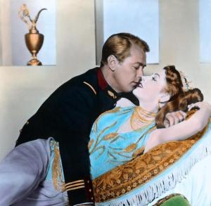 As fanciful adventures go, this one’s a doofy doozy. After his company of Legionnaires is ambushed in an Algerian canyon and wiped out, knocked unconscious sole survivor ‘Capt. Paul Lartal’ (Ladd) awakes in a tent to behold ‘ Princess Morjana’ (Arlene Dahl) a red-tressed, ivory skinned, blue-eyed beauty (like you’d normally bump into in Algeria) whose attentions (and basic vavoomishness) lead him to the secret mountain city of ‘Madara’, a sort of Lost Horizon’y situation (again, common in the Sahara Desert) complete with phony backdrops and budget-impaired sets. “Tonight at dinner you meet the man we call our leader“, who turns out to be the nefarious usurper ‘Crito Damou’ (Richard Conte), dripping with insinuation. Will Alan and Arlene fall turban over veil for each other? Does she have an inexhaustible supply of princess-wear costumes? Will sinuous dancing girls do a number that’s at least a continent removed from North Africa? Will Ladd and Conte fight to the death on a cliff while a battle finale rages around them? Would I have enjoyed this nonsense as a kid? Yep.