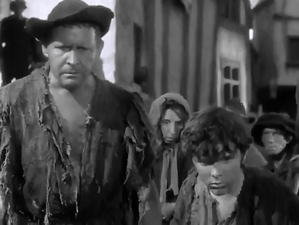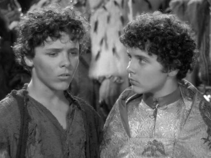 Nocking their own arrows to target are Claude Rains, oozing sophisticated treachery as Hertford; Barton MacLane, mad-bull on two legs as the nightmare father ‘John Canty; Alan Hale, dropping heartiness for heartlessness as ‘The Captain Of The Guard’, in the first of 14 times he would work with Flynn; and Montagu Love, growling with arrogant certainty as Henry VIII, a turn not dimmed by the lauded interpretation hammed to a fare-thee-well four years earlier by Charles Laughton. Yet the good work from the grownups wouldn’t have counted much without the right choices to play the central roles of Edward and Tom. The show lucked out with the boys, put across with pluck and a welcome lack of ‘child actor’ affect by 15-year old twins Billy and Bobby Mauch. Only a handful of the youthful performers of the day (say, Freddie Bartholomew, 13, or Mickey Rooney, 16) leapt the cringe bar, and even though the Mauch (pronounced ‘Mock’) lads don’t conceal their birthright (Peoria, Illinois to London a good 4,075 miles) their openness, sincerity and winsome natures more than make up for any diction friction. ***