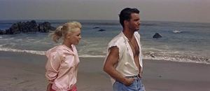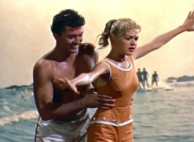 The quartet The Four Preps, who do the title tune, had just aced two 1958 hits: “Big Man” (#3 charter, and a fave of this beach boy) and “26 Miles/Santa Catalina”, which took #2 and, like this movie, is considered key in helping prod the surf craze wave that rolled in big time in 1963 with Beach Party and the music of Jan & Dean, The Beach Boys, The Surfaris, The Rivieras, etc. Everyone ‘discovered’ California, millions piled in.