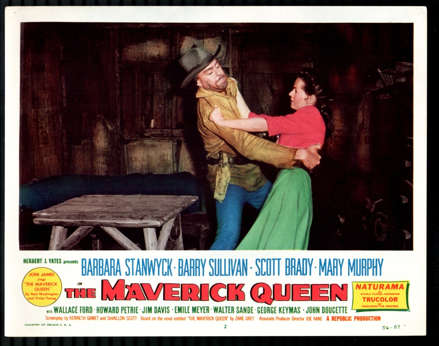 THE MAVERICK QUEEN once again puts Barbara Stanwyck in a western, once again as a boss of a private fiefdom, and once more saddled with competent but bland Barry Sullivan as a leading man. Directed by Joe Kane, who served in that capacity for a slew of popcorn B-westerns—16 with Gene Autry, 15 with Roy Rogers, five with John Wayne,—this one from 1956 based on a Zane Grey novel. The title tune is sung by Joni James, sounding rather like Patti Page. *
