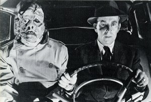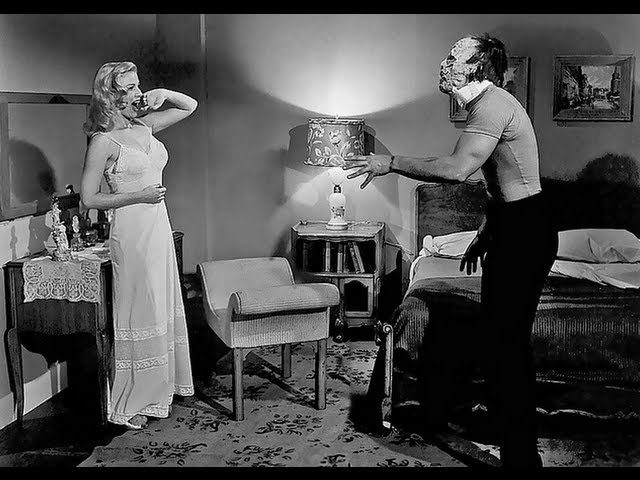Not as successful as I Was A Teenage Werewolf, this did make $900,000, easily covering what looks like $90 spent to make it. As with the earlier epic, the writing was the work of Aben Kandel and Herman Cohen. Pedestrian is the kindest word for the direction from Herbert L. Strock, though composer Paul Dunlap tries to add some suspense with his scoring. Visiting the States from England (managing to leave his accent somewhere over the Atlantic), ‘Professor Frankenstein’ (Bissell, out & out nasty) decides he can stay around the colonies for a while, using his fiancee (Phyllis Coates) as a secretary while he and his blackmailed assistant (Robert Burton) collect ‘material’ for experiments that he insists will shake the world and make him look like a savior. One of those types. Among those he harvests is ‘Bob’, played by Gary Conway and one of the sillier monster masks ever. There’s a lotta talk in the 74 minutes, most famously the hard to top “Speak! You have a civil tongue in your head! I know you have, because I sewed it back myself!”