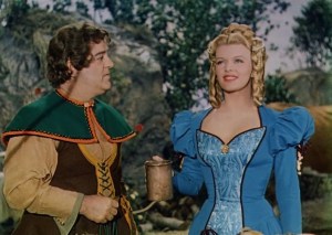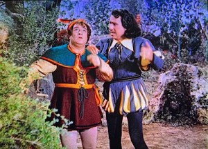 Like another musical-comedy fantasy that landed over the rainbow in 1939, this kidder for kiddies starts with characters in the ‘real world’ (the present of 1952) and in sepia tone, switching to the “once upon a time” zone and suitably gaudy color with the cast members in persona-fitting swaps of identity. You don’t have to be older than three to see that kidhearted Lou will inhabit ‘Jack Strong’, clamber up that magical legume ladder, rescue a princess (blonde, natch), redeem his normal doofitude and bring about the fall from a great height of a big, bad, bearded foe-fummer. The all-demanding giant is done to a brute tee by hulk & ½ Buddy Baer, last seen wrestling a Kerr-bound bull in Quo Vadis. Bud, naturally, is up to his usual tricks, this time christened ‘Mr. Dinklepuss’. The songs are goofy, the dancing goofier, the spirit is in the right place for the time-tested saga. Can you remember the first time you saw or were told the story?