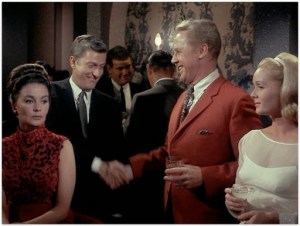 Scoring wins in the ace supporting cast are Shelley Berman, supremely sly & dry as Barbara’s divorce attorney viper; Joe Flynn, in his best big screen role, as Robert’s just-trying-to-help pal; Martin Gabel, chewing insinuating syllables as a smug marriage counselor; Emmaline Henry, skillful deadpan as Barbara’s loyal girlfriend. It’s a shame that when people think of Dick Van Dyke’s movie career, a mixed bag, they usually stop at Mary Poppins (his worst performance) and totally miss his excellent turn in this picture; though some may opt for Bye Bye Birdie, others The Comic, we’d call this his best big screen job. He’s well-matched with Reynolds, 35, who, with How The West Was Won, does her keenest work of the 60s. Though a skilled comedienne, her comedies from the decade were mostly lame (Mary Mary, My Six Loves, Goodbye Charlie, The Singing Nun, How Sweet It Is!–and the indigestible The Unsinkable Molly Brown, which for some reason got her an Oscar nomination. She’s allowed some fire & ice here and her no-win skirmishes with Van Dyke are choice cuts.