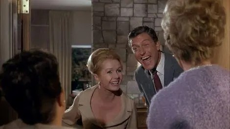 Scoring wins in the ace supporting cast are Shelley Berman, supremely sly & dry as Barbara’s divorce attorney viper; Joe Flynn, in his best big screen role, as Robert’s just-trying-to-help pal; Martin Gabel, chewing insinuating syllables as a smug marriage counselor; Emmaline Henry, skillful deadpan as Barbara’s loyal girlfriend. It’s a shame that when people think of Dick Van Dyke’s movie career, a mixed bag, they usually stop at Mary Poppins (his worst performance) and totally miss his excellent turn in this picture; though some may opt for Bye Bye Birdie, others The Comic, we’d call this his best big screen job. He’s well-matched with Reynolds, 35, who, with How The West Was Won, does her keenest work of the 60s. Though a skilled comedienne, her comedies from the decade were mostly lame (Mary Mary, My Six Loves, Goodbye Charlie, The Singing Nun, How Sweet It Is!–and the indigestible The Unsinkable Molly Brown, which for some reason got her an Oscar nomination. She’s allowed some fire & ice here and her no-win skirmishes with Van Dyke are choice cuts.