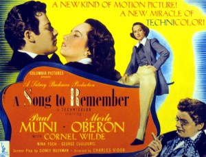 A SONG TO REMEMBER joined a long list of synthetic screen concoctions about famous composers, in this florid 1945 entry the artiste du jour being Frederic Chopin. Directed by Charles Vidor, it made a star of likable 31-year-old Cornel Wilde, even nabbing him an Oscar nomination as Best Actor. Playing fast and loose with facts, Sidney Buchman’s screenplay uses Chopin’s Polish heritage as a bridge to inject WW2-related rally-for-democracy material viz a viz the war’s evisceration of Poland by Hitler and Stalin, and makes a good deal of blame gaming around the composer’s affair with controversial writer George Sand, played with imperious iciness by Merle Oberon. Even more than extolling Chopin, enabling Poland and slamming Sand, the movie serves a vehicle for Paul Muni to shamelessly ham like it was the last chance at scene-hogging he’d ever get. As composer Józef Elsner, Chopin’s music teacher, battling for Frederic’s wavering soul over the selfish desires of Ms. Sand, Muni does everything to remind you HE is in a scene but yank his teeth out and hurl them at the screen.