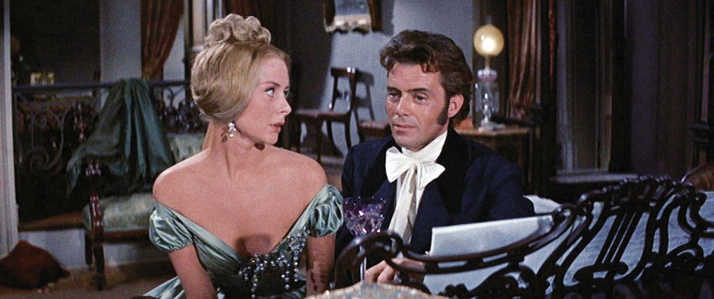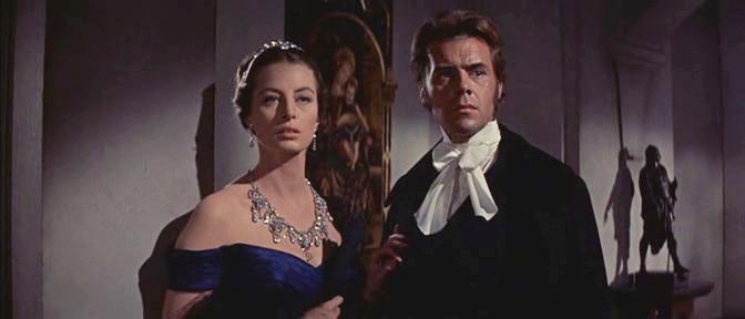 While Page scores, Capucine in her English-speaking debut is almost a dead loss; she drew scathing reviews. Whoever—Vidor or Cukor— gave her that orgasmic seduction scene, swooning off her Royal chemises while Franz atomizes the ivory—was either clueless or vindictive. Other than that quick ascent of Mont Blanc she’s so inexpressive she may as well be wax. We fault the directors, since her next role, the decidedly unpretentious North To Alaska, showed her animate and charming.