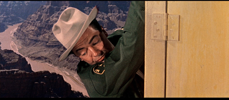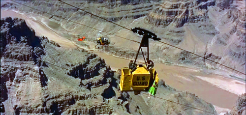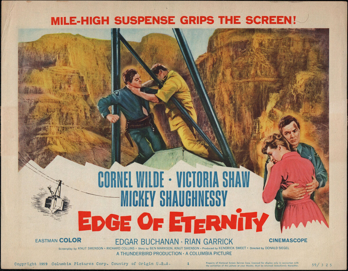 Written by Knut Swenson aka Marion Hargrove (See Here Private Hargrove, The Music Man) and Richard Collins (Pay Or Die!), the plot kicked off (literally) by the plummet homicide gives Mohave County Deputy ‘Les Martin’ (Cornel Wilde) a case to mull, one that grows with two new murders, seemingly linked. In his spare time the amiable lawman (who has past case mistakes that dog him) draws the attention of local beauty (and speed demon) ‘Janice Kendon’ (Victoria Shaw), daughter of a wealthy miner, and sister to a drunk punk. When it’s time to settle the mystery, Siegel and his (apparently half-crazy) stunt personnel stage a doozy of a death match on a cable car, swaying back & forth thousands of feet over the canyon. Pretty cool.