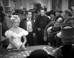 San Francisco, 1850. Arriving in the pea-soup fog of the Bay, ‘Mary Rutledge’ (Miriam Hopkins, 32) thinks she’s there to wed the owner of a gold mine, only to find he’s dead, likely murdered. That was probably by the kingpin owner of the ‘Bella Donna’, fancy-attired but fierce ‘Louis Chamalis’ (Edward G. Robinson), who employs minions like cheerfully corrupt ‘Old Atrocity’ (Walter Brennan) and ‘Knuckles Jacoby’ (Brian Donlevy), dark-clad and black at heart. Switching gears faster than you can say “gold-digger” Mary goes to work for Chamalis as a roulette hustler; he admiringly christens her ‘Swan’—was this the first Hawksian woman with a nickname? Then, gear-switch part 2; she has a meet-sweet with handsome miner ‘Jim Carmichael’ (Joel McCrea), who is part naive-bumpkin/part erudite scholar who spews literary references faster than Swan can spin the rigged roulette wheel back at the Bella Donna. Someone, or two, are going to get jealous, ripped off, hurt and even.