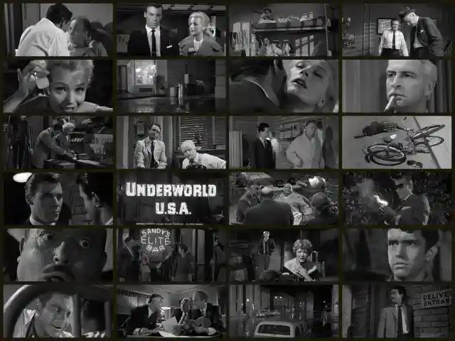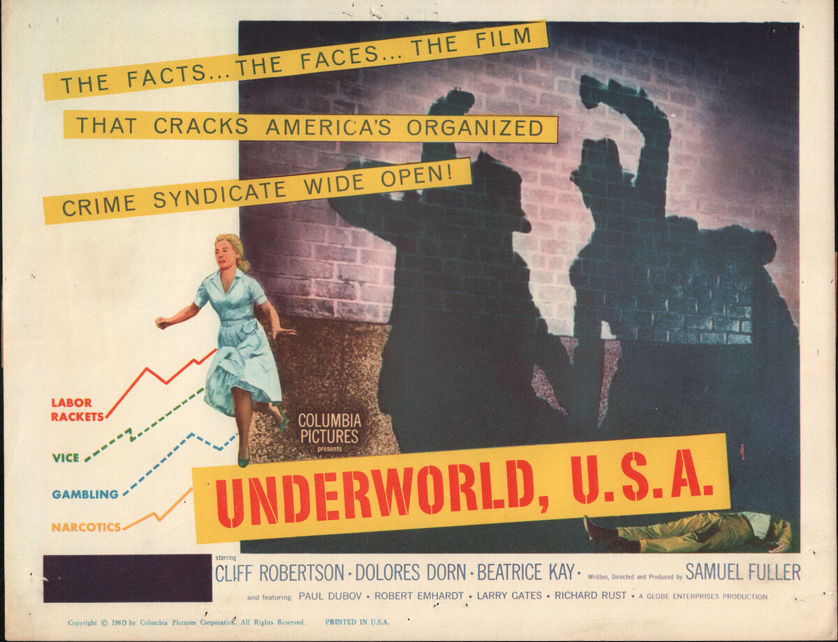 UNDERWORLD U.S.A. is another in-your-mug frontal assault from ever pugnacious, rarely reticent Samuel Fuller, who wrote, produced & directed this 1961 revenge repast, one which combines the best & less-best of his maverick style. A former big city crime reporter and WW2 combat vet, he favored stories revolving around crime or combat, usually with characters compromised to one degree or another by temperament or environment. The war sagas play better, the crime ventures leaning—or careening—into exploitation. Made on the cheap (maybe $1,000,000, it looks like less), this recipe rehash cooked up $2,500,000. That was 84th place in 1961, a year otherwise dominated by animated Dalmatians, angry Jets & Sharks and awesome cannons on an island in the Aegean. *