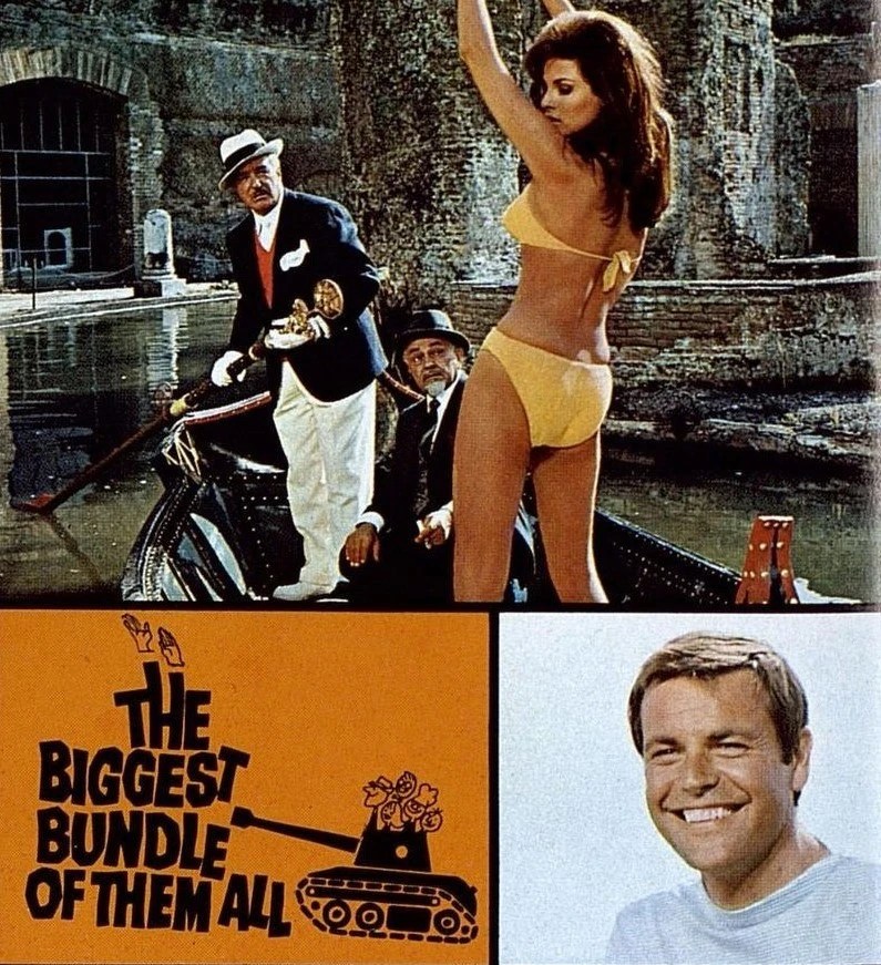 THE BIGGEST BUNDLE OF THEM ALL, a 1968 heist comedy, tried to hijack audiences with the front & center casting of Raquel Welch, but despite a proven director (Ken Annakin), bright French & Italian locations, and a few venerable cast members giving their all, it didn’t deliver a bundle but dropped one, the $1,100,000 gross against a cost of $2,000,000. It bears some resemblance to The Happening, a dud released the year before. It’s better than that one, and makes for a mildly amusing diversion.