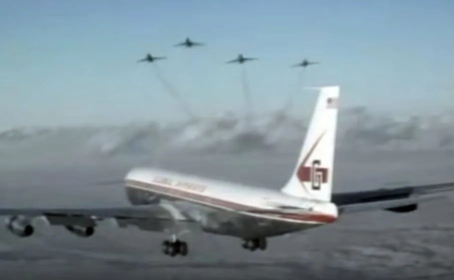 Actually, Heston is quite good, one of the strongest components in the piece, restrained in service of the material rather than engaging in grandstanding. The exterior footage of the planes is a plus, with neat shots of the captive Boeing 707 and of a quartet of North American F-100 Super Sabre’s posing as Soviet fighters.