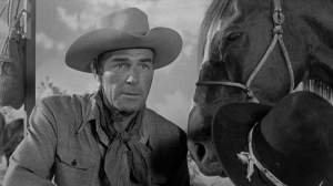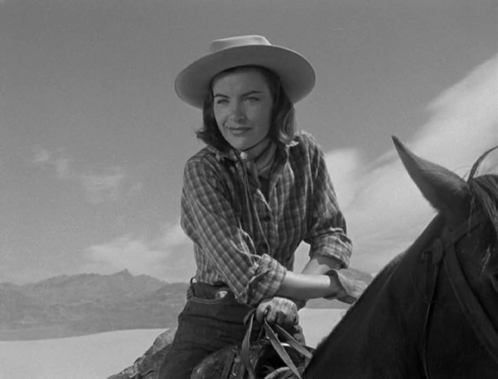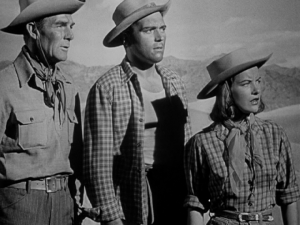 Besides calm-seeming horse breeder ‘Jim’ (Scott) and his spirited ex ‘Chris’ (Ella Raines), there’s her current flame ‘Dave’ (William Bishop), in trouble with the law, caustic cop ‘Frazee’ (John Ireland), packing heat and attitude, surly drifter ‘Chalk’ (Arthur Kennedy), garrulous prospector ‘Old Willy’ (Edgar Buchanan), young cowboy ‘Johnny’ (Jerome Courtland), barman “Bibbs’ (Russell Collins), guitar playing blue singer ‘Josh’ (Josh White) and ‘Cleve’ (Charles Stevens), Jim’s ranching amigo. Temperaments tell as desire, loyalty and self-preservation are tested by natural elements like a violent sandstorm.