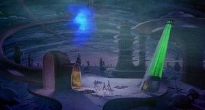 The Final Frontier had to wait because the 86 minutes of Man Meets Mutant kid-pleasing begins with a triumphant blast of “Look at us!” music that blankets worshipful overhead views of Washington D.C. in the opening shots, signalling that Ike’s best & brightest are ready for anything from Russki ICBM’s to Guatemalan peasants. But were we really prepared for 7-inch foreheads, an ‘interocitor’ that “has 2,486 parts“, a leading man (Rex Reason as studley ‘Dr. Cal Meacham’) who aced the contest for Deepest Manly Voice in Hollywood and a lady scientist (Faith Domergue as ‘Dr. Ruth Adams’), whose smouldering shoulders are due to be seized & squeezed by one of the weirdest, most identifiable monsters of the era? These probing questions are answered easier than any of the ‘scientific’ ones presented in the pulpish script written by Franklin Coen (The Train) and Edward G. O’Callaghan. Don’t forget (fore)heady input from Jeff Morrow as ‘Exeter’, the suavely serious ambassador who beseeches help from Earth intellectuals in order to save his home orb from being pulverized into so many free-ranging atoms.