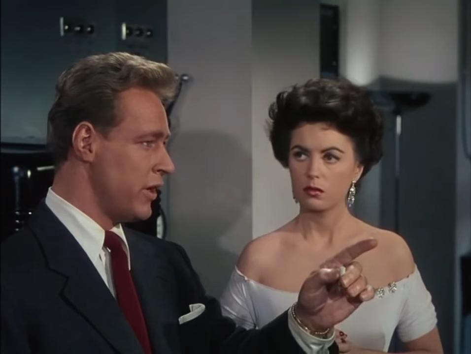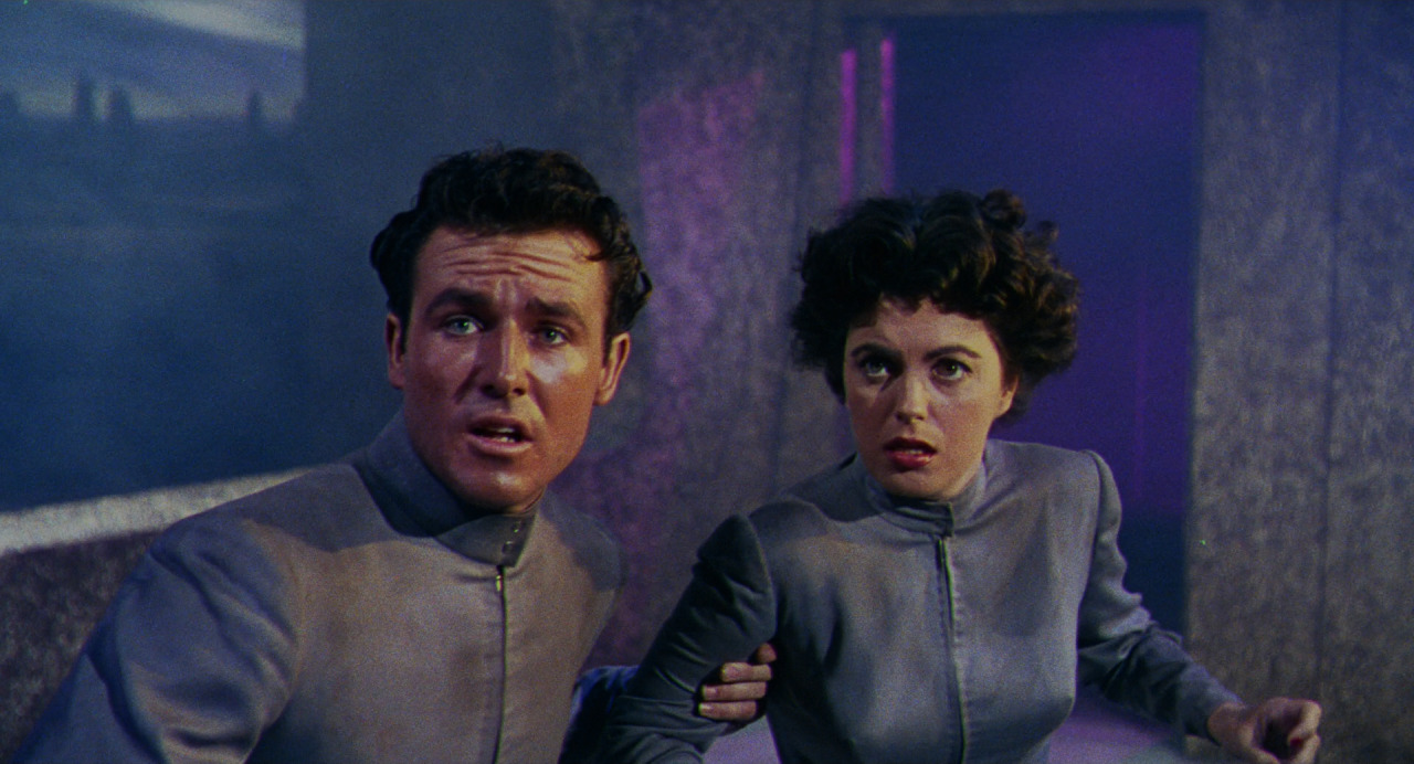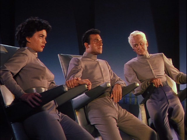 The Final Frontier had to wait because the 86 minutes of Man Meets Mutant kid-pleasing begins with a triumphant blast of “Look at us!” music that blankets worshipful overhead views of Washington D.C. in the opening shots, signalling that Ike’s best & brightest are ready for anything from Russki ICBM’s to Guatemalan peasants. But were we really prepared for 7-inch foreheads, an ‘interocitor’ that “has 2,486 parts“, a leading man (Rex Reason as studley ‘Dr. Cal Meacham’) who aced the contest for Deepest Manly Voice in Hollywood and a lady scientist (Faith Domergue as ‘Dr. Ruth Adams’), whose smouldering shoulders are due to be seized & squeezed by one of the weirdest, most identifiable monsters of the era? These probing questions are answered easier than any of the ‘scientific’ ones presented in the pulpish script written by Franklin Coen (The Train) and Edward G. O’Callaghan. Don’t forget (fore)heady input from Jeff Morrow as ‘Exeter’, the suavely serious ambassador who beseeches help from Earth intellectuals in order to save his home orb from being pulverized into so many free-ranging atoms.